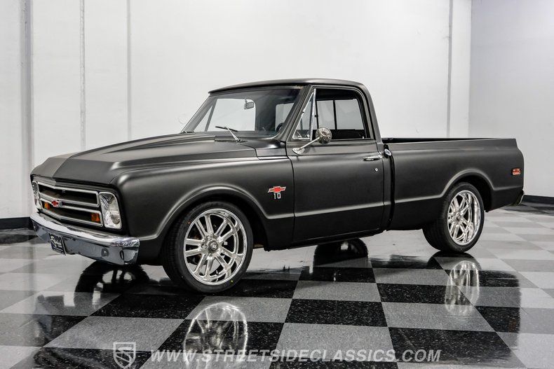 This 1968 Chevrolet C10 is a truck that embodies the raw spirit of classic American muscle with a modern twist. Cloaked in a sleek satin black wrap, this C10 is more than just a vehicle, it's a statement of style, power, and individuality. Imagine cruising down the open road, turning heads with its lowered stance and aggressive 20-inch US Mags, all while enjoying the nostalgic rumble of a V8 engine. This is a truck for those who appreciate heritage and performance, wrapped into one compelling package.