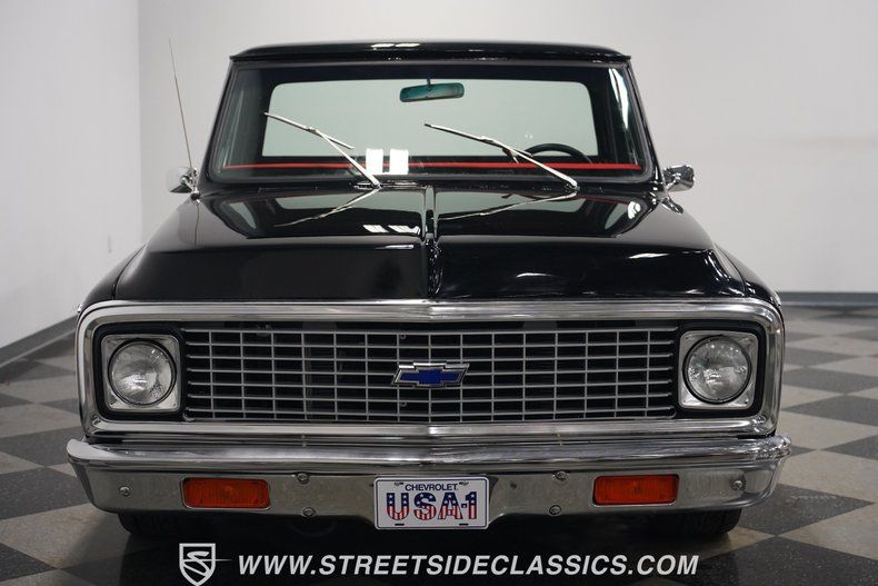 Murdered-out and ready to rumble, this 1972 Chevrolet C10 wears its black paint job like a boxer wears his gloves - with purpose and attitude. Freshly resprayed for maximum impact, the sleek bodywork features a custom-smoothed tailgate and strategically relocated fuel tank underneath the bed for cleaner lines. Chrome bumpers and crisp belt line trim cut through the darkness, providing perfect visual counterpoints against the midnight canvas. Slammed to the pavement through custom suspension work, this muscle truck hunkers down over massive 22" US Mag wheels, with 255/30ZR22 front and 285/35R22 rear rubber that plant it firmly on the street with undeniable presence.