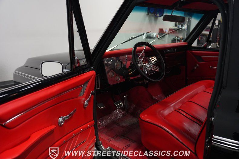 Red-hot and ready for action, the cabin of this C10 grabs your attention with vibrant red vinyl bench seating that pops against the exterior's dark demeanor. Custom door panels match the seating surfaces for a cohesive, deliberate design statement. The dashboard houses clear aftermarket gauges in a purpose-built binnacle, giving you instant access to vital engine information. Entertainment comes courtesy of a Pioneer AM/FM/AUX stereo that provides the soundtrack for your cruising adventures. A sporty aftermarket steering wheel feels solid in your hands, with the column shifter positioned perfectly for quick gear selection when it's time to move.