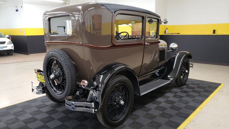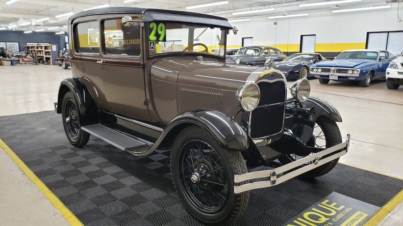1929 Ford Model A Tudor Sedan with a great looking two tone paint scheme of brown and black with tasteful orange pin striping. That paint overall showing well with a few character marks showing its history. Fenders and body are all steel in this car. 201 L head Inline 4 cyl under the hood, paired up with a 3 speed manual transmission with overdrive. Chrome in overall good condition. Riding on black wire spoked wheels. Cloth interior also in nice shape with bucket seats up front and a bench in the rear. There is a push/pull lever just to the left of the steering column to operate the overdrive, and a fuel shut-off valve under the right side of the dash. A typical manual choke is also attached to the right side of the dash, as well as a horn pull. Typical starter button on the floor to get that motor running. A very smooth running Model A!