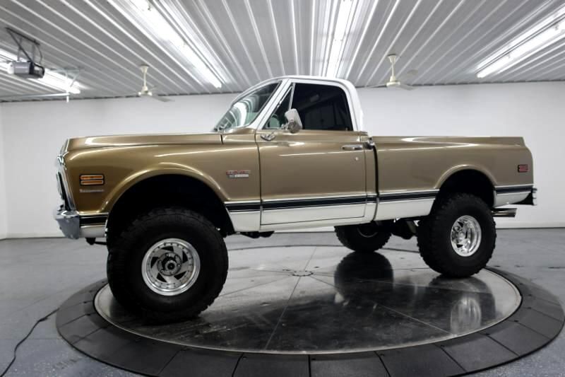 1970 GMC K15 4x4 This beautiful truck features a matching numbers 350 engine a 350 turbo automatic transmission Dena 44 front axle GM 12 Bolt posi rear end 4.11 gears 2 1/2 inch dual exhaust this beautiful truck has been rotisserie restored and You would be hard-pressed to find onenicer this is one gorgeous truck. Power steering power brakes Vintage air-conditioning serpentine pulleys fin valve covers fender air cleaner fiend oil caps aluminum power steering pump dual electric fans scorpion bedliner wood bed floor with stainless slats smoky Road aluminum bed chrome AC compressor chrome water pump chrome alternator chrome serpentine front drive system new process 205 transfer case Dix CPX cross country 3512 5015 tires four-wheel-drive lockout all new interior new seat new carpet new door panels new seal plates rebuilt instrument cluster the list goes on and on and on the chrome stainless and bright work on this truck a second to none this is one gorgeous ride I drove this truck the other day down the road I stopped a couple places people fell in love with this truck it is original two tone paint scheme and the GMCs are hard to find this is a gorgeous truck dont miss your opportunity to own it Give us a call today and let us bring it from our show room to your garage!