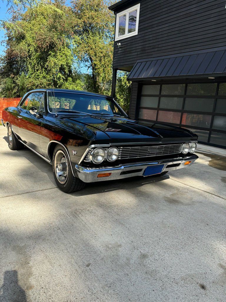 This 1966 Chevrolet Chevelle Malibu sport coupe was refurbished from 2016 to 2023. Work involved installing a BluePrint 383ci stroker V8, refinishing and reupholstering the car in black, and overhauling the suspension and brakes. Equipment includes a three-speed automatic transmission, a 10-bolt Yukon Gear 3.36:1 Positraction limited-slip rear differential, Holley Sniper EFI, exhaust headers, front and rear coilovers, front disc brakes, 15 rally-style wheels, digital readouts, electric windows, a B&M shifter, and an aftermarket stereo