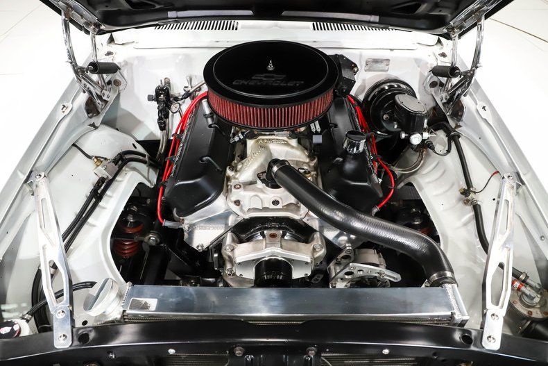 ENGINE COMPARTMENT: The 427 has been boosted to 439 cubic inches and is making about 600 horses! It has all the best components: a steel crank, polished rods, forged pistons, solid roller Com Cam, roller rockers, Meloing oil pump, ARP fasteners, Clevite bearings, Pete Jackson gear drive, fluid dampener balancer and more. On top is a set of GM Performance aluminum heads, Edelbrock air gap intake and a Holley 750 carb and an MSD Pro Billet distributor. A set of Dynatech headers flank each side. Premium fuel fittings, braided lines and a fuel regulator were used. It is using an external vacuum pump to make up for the lost vacuum from the radical cam. It's dressed in some really nice looking cast aluminum valve covers and air cleaner that say Chevrolet. A big aluminum radiator with dual electric fans and an aluminum electric water pump keeps it running cool. Horns are hooked up, wiper motor has been replaced, it has chrome hinges and billet fender supports. Premium braided hoses were used for the transmission cooler lines to the radiator.