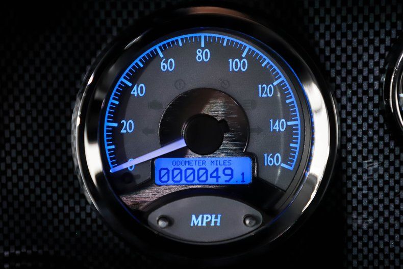 INTERIOR: Very tastefully done custom interior! It has TMI sport bucket seats with a matching back seat. Custom molded door panels have suede inserts and custom speakers. It has a nice center console with cup holders and there's a B&M slapstick shifter in front of it. I like the leather-wrapped, cushion grip steering wheel mounted to a tilt column. It has a custom dash insert with blue lit gauges and a Vintage Air electric climate control system. A retro stereo powers those speakers and a set of 6x9s in the back. The custom suede headliner fits really nice and there's a billet mirror attached to the windshield. The carpet was also replaced and there is sound deadener underneath. A basic roll bar was neatly painted body color.