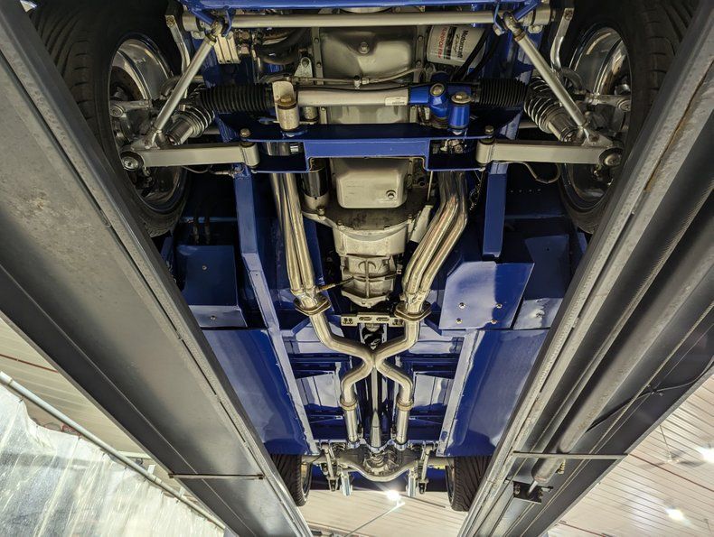 UNDERSIDE: Full frame custom suspension from Martz Chassis. Upfront is a completely reconfigured independent suspension with coilover adjustable gas shocks, a splined swaybar, and rack & pinion steering. This ties into an actual boxed frame that connects to the rear clip. In back is a 4 link system with tubular control arms, a panhard bar, splined swaybar and coilover adjustable gas shocks. Looking up at the engine everything looks fresh and clean. The Tremec 5 speed manual transmission has a Ford Racing clutch and a custom aluminum mount. A fresh driveshaft leads to the Ford 9 inch rear end with Moser axles and 4.11 posi gears. The floor pans were all custom fabricated and hide the wires and lines. It's painted as slick underneath as on top.