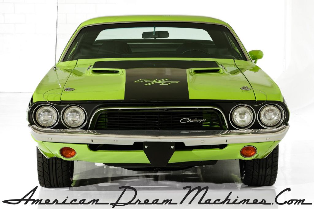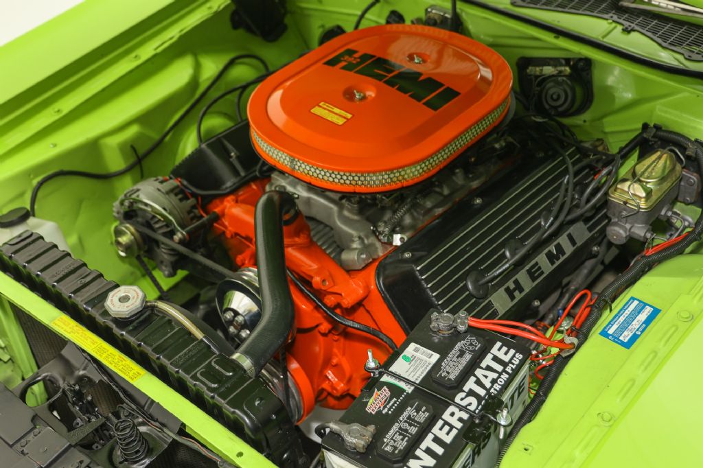 This mean Sublime Green 1972 Rally Challenger Street Beast is built to burn rubber with a 392 Hemi power plant, topped off with dual quad carburetors, Hemi RT options, graphics and badging. This Sublime green Rally Challenger is packing a massive rebuilt 392 Hemi engine under the hood a is launch into high gear with a 727 automatic transmission and slapstick shifter, disc brakes to control the power and backed up by a heavy duty posi-traction rear end. The black bucket seat interior is in exceptional condition with center console, wood accents and Rally gauges. This Mopar street beast is rolling on brand new American Racing chrome 5 spoke wheels and new performance radials to put the rubber to the road. These can be exchanged if you prefer the stock look.