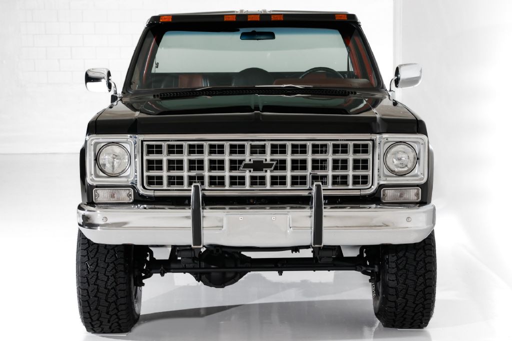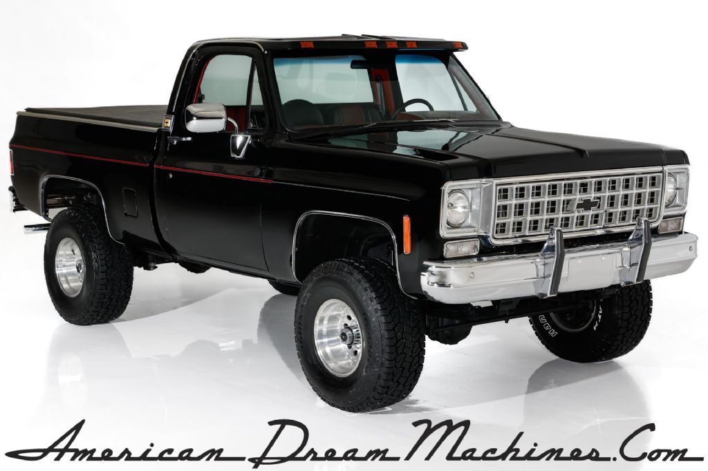 An extensive restoration was completed on this black 1976 Chevrolet K10 Silverado 4x4 short bed pickup. The engine and truck have only around 1001 miles since finished. This rock solid, Silverado K10 pickup was sanded down to bare metal and any metal that was not good enough was replaced, before being professionally painted in mirror finish black a red Chevrolet pinstripe accent. Under the hood is a show quality engine compartment showcasing a fresh 350 engine topped off with chrome Chevrolet valve covers, nicely paired with 4-speed transmission, power steering and power disc brakes. The black interior with match the outside perfectly and have a center buddy seat that folds down for storage and beverages. The dash is in excellent shape with newer clear crisp instrumentation and the odometer shown only 1001 miles. The original Chevrolet Delco radio is still intact and a Bluetooth stereo nicely concealed in the glove box. This beautiful truck is riding high on ProComp aluminum rims and Hankook DynaPro All-Terrain radials for that amazing 4x4 off road look.
