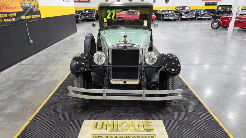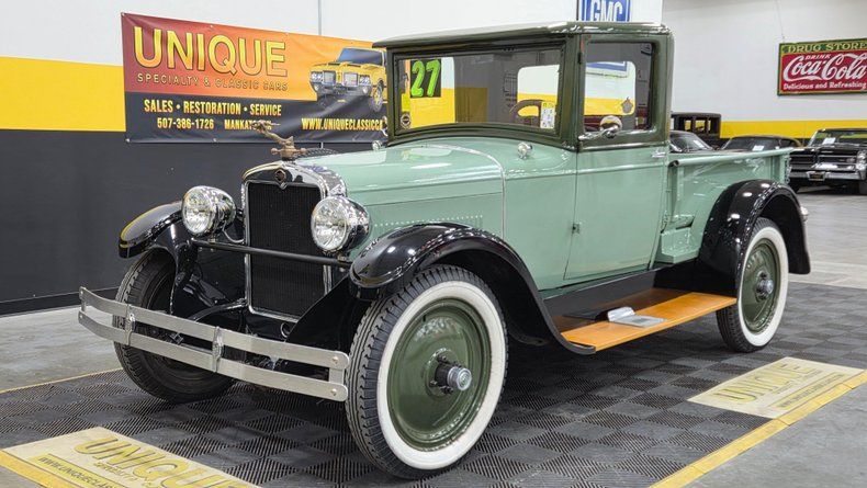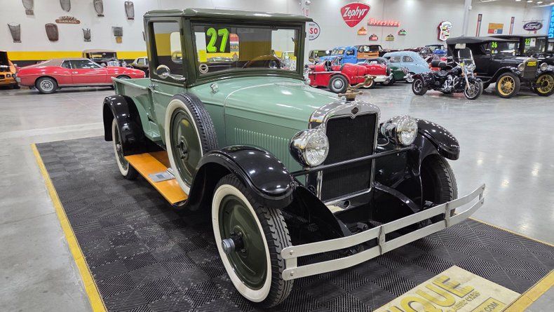 1927 Nash pickup truck, originally converted from a 1927 Nash deluxe sedan. This unique vehicle, highlighted for its antique charm and historical significance, has undergone a custom transformation to function as a pickup truck, reflecting the ingenuity and resourcefulness common during the Great Depression era. Green two-tone paint scheme with black fenders, mechanical brakes, a well-preserved inline L-head six-cylinder engine, and a three-speed manual transmission. Notable features include a mermaid-shaped radiator cap, Nash-branded tailgate, wooden running boards, and original style wood slats in the bed. The cab interior maintains wood-framing and features a wooden steering wheel. The door glass has recently been replaced. Driving the truck reveals the it to be smooth running and easy to maneuver, with a comfortable driving position. This includes the original headlamps that come in a box with the truck.