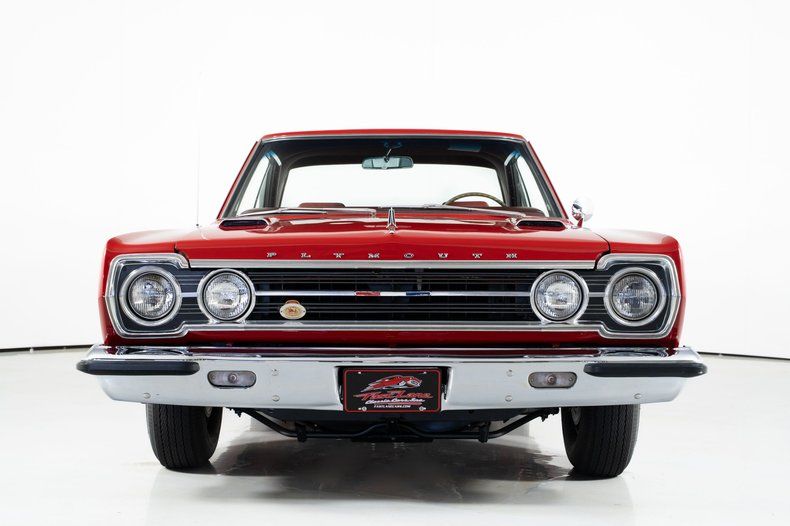 The exterior is finished in a brilliant Bright Red, accented by dual hood scoops and matching red steel wheels wrapped in classic redline tires. Dog dish hubcaps complete the no-nonsense, factory-correct look that made the '67 GTX a standout from the start. Inside, the red vinyl bucket seat interior is as clean and commanding as the exterior, featuring a center console and a period-correct Mopar 8-track player to keep the vintage vibes alive.