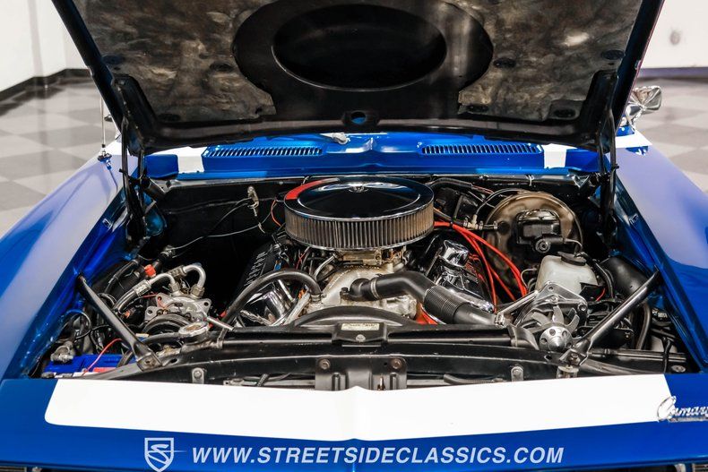 Muscle car madness reached its peak in 1969, and this Chevrolet Camaro RS/SS 454 Tribute emerges in blue metallic with white painted stripes and a white vinyl halo roof. Cowl induction hood adds functional lines while 17" Ridler wheels wrapped in 235/45ZR17 Continental front tires and 255/45ZR17 Continental rear tires complete the stance. Hotchkis subframe connectors reinforce the foundation, and dual exhaust with Flowmaster mufflers announces its presence. Hooker long tube headers feed the exhaust system while the rear spoiler adds visual weight to the tail.