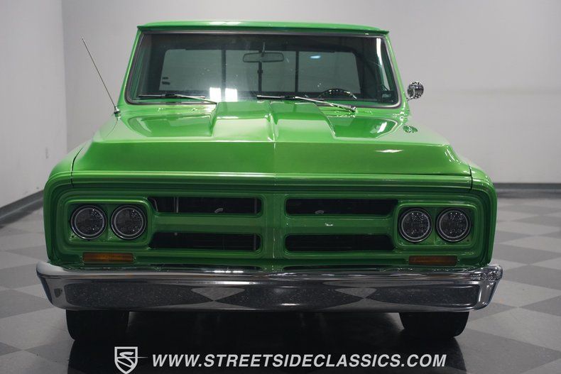 Fully restored and upgraded for modern performance, this 1971 GMC C1500 brings together old-school truck character and contemporary enhancements. Finished in a rich green color, the exterior features a custom cowl hood for a more aggressive look. The elimination of vent windows and addition of a roll pan create cleaner lines throughout. Chrome accents contrast nicely against the green paint, while the aftermarket lighting package adds a current touch. The bed comes equipped with a spray-in liner and rubber mat for durability. Those massive 20" U. S. Mags wheels with 255/40R20 front and 295/45R20 rear tires give the truck a substantial road presence.