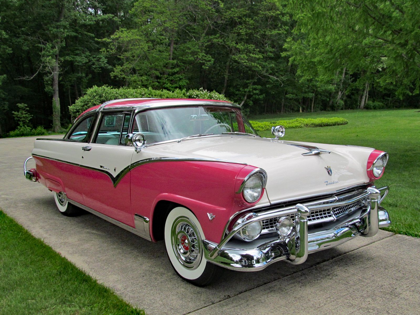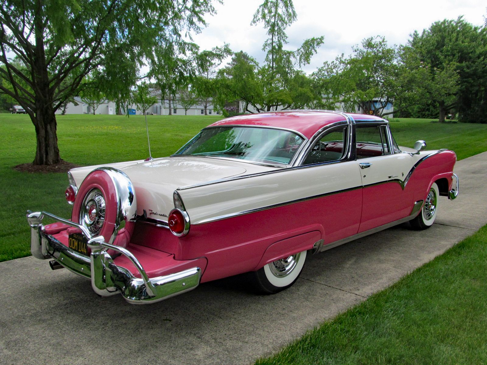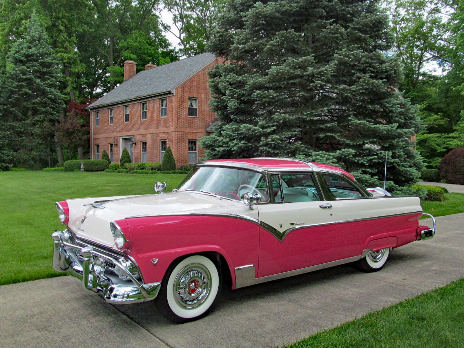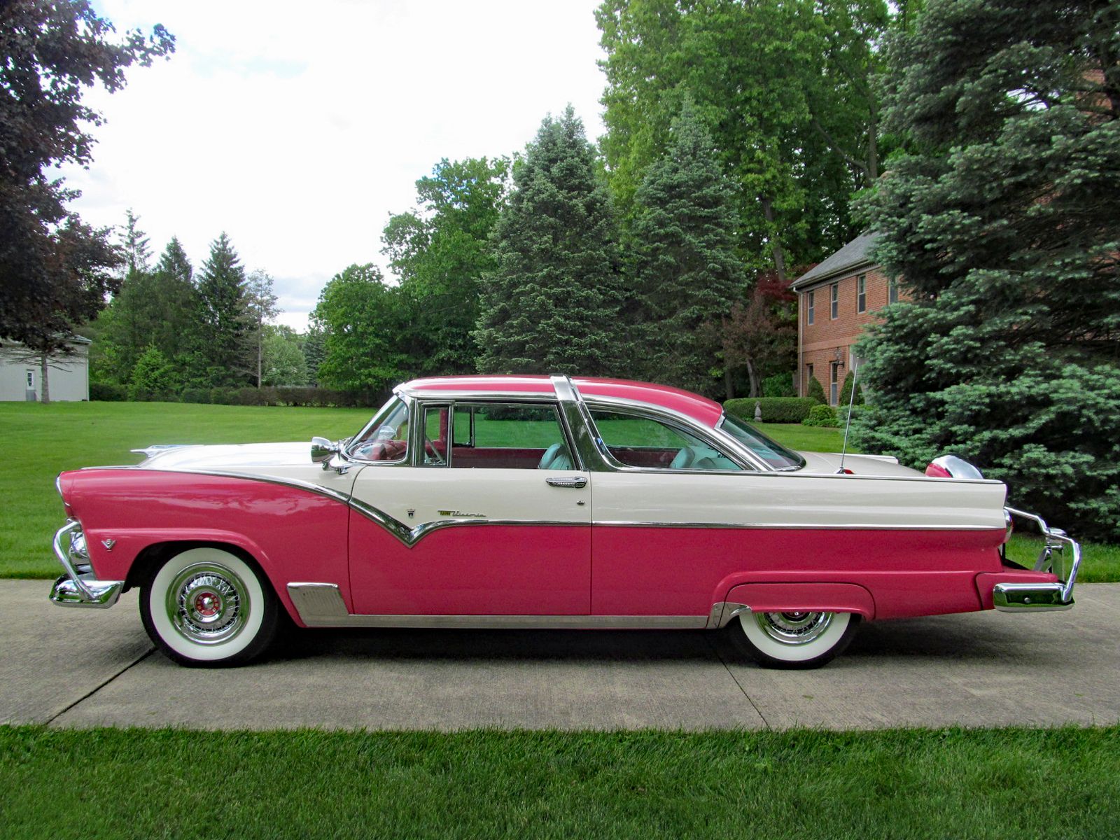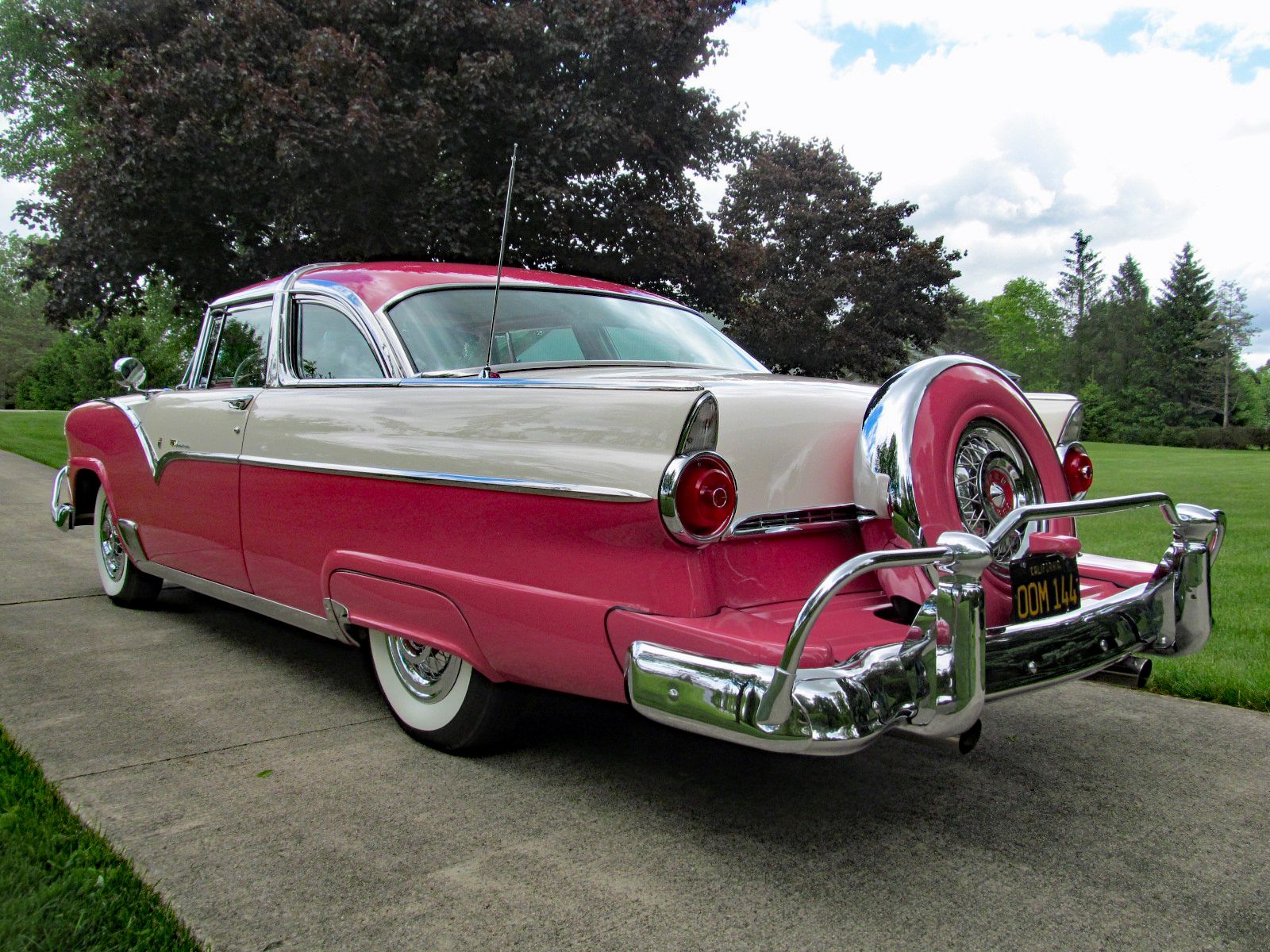 1955 Ford Fairlane Crown Victoria with Factory Air Conditioning! Call Pete or Andy 419-668-1884. Absolutely Spectacular Off Frame Restoration! Highly Detailed Chassis. Without a doubt one of the finest Crown Victorias in existence. This car was restored to be a showstopper. Finished in Tropical Rose and Snowshoe White. The Interior is finished in Magenta and White vinyl. Powered by Ford’s 272 Cubic Inch Y-Block V-8. Dual Exhaust. Ford-O-Matic Automatic Transmission. This Crown Victoria is Loaded with Options and Accessories. Ultra Rare Factory Air Conditioning. 1955 Was the first year Ford offered Air Conditioning. Ultra Rare “Thunderbird Style” Accessory Steering Wheel. Power Steering. Power Brakes. Power Windows. Power Seat. Tinted Glass. Front and Rear Bumper Guards. Dual Spot Lamps. Fog Lamps. Day-Nite Rear View Mirror. Map Light. Glove Box Light. Trunk Light. Under Hood Light. Tissue Dispenser. AM-Radio. Rear Seat Speaker. Clock. Continental Spare Wheel. Deluxe Rocker Trim. Accessory Rear Antenna. Door Handle Guards. Locking Gas Cap. Wire Wheel Hup Caps. White Wall Tires. Converted to 12-Volt Electrical System. Ready to Drive, Show and Enjoy. Call Pete or Andy 419-668-1884 BE SURE TO WATCH THE VIDEO!