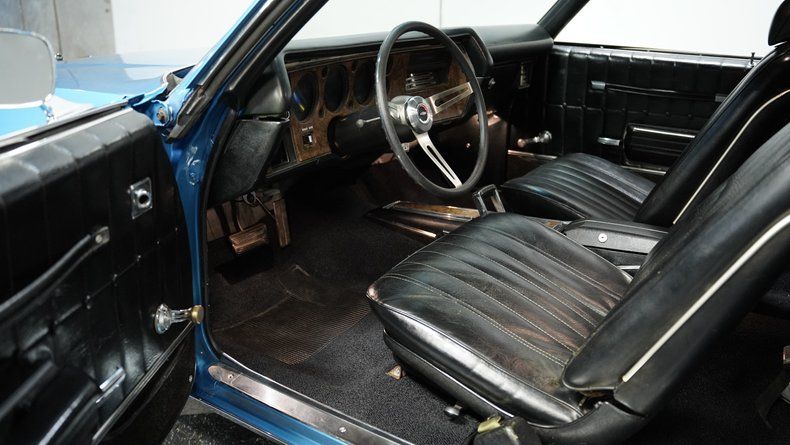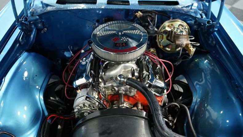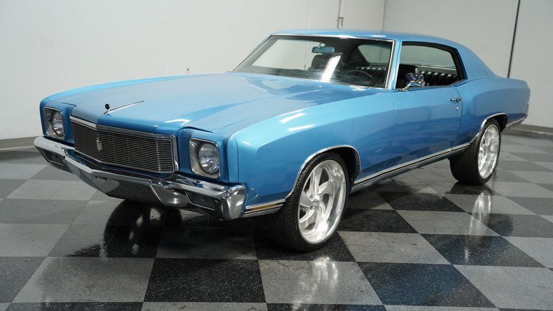 A rare fusion of muscle and luxury from Chevrolet's golden portfolio. This 1971 Chevrolet Monte Carlo 454 flaunts Marina Blue paint that follows every curve of its substantial flanks. Chrome bumpers bookend the body, adding bright accents against the blue finish. The 20" U. S. Mags wheels fill the wheel wells with modern flair, wrapped in performance-oriented 245/35ZR20 front and 275/35ZR20 rear tires that provide both visual impact and road-hugging grip.