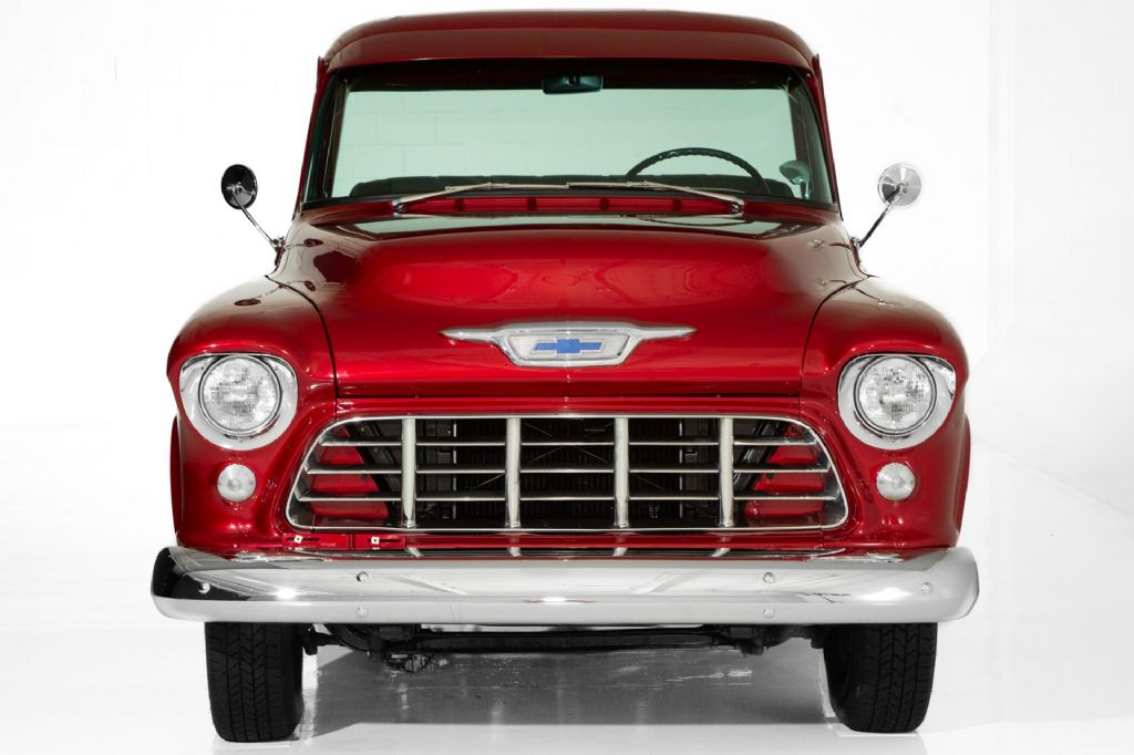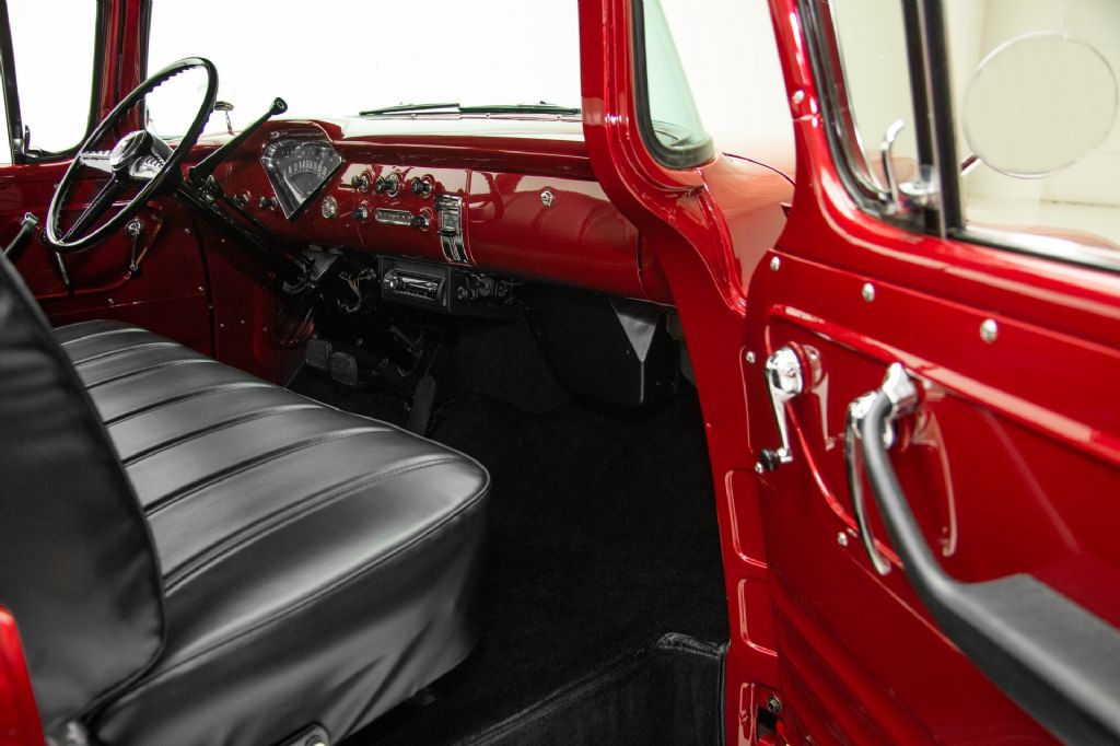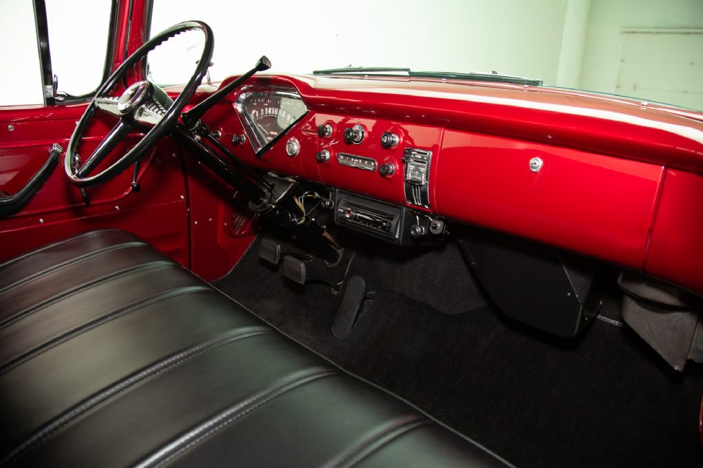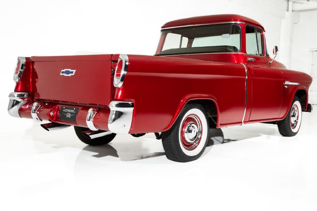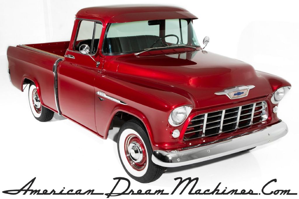 Rare drop dead gorgeous 1955 Chevrolet Cameo 3100 big back window pickup painted in deep dark burgundy metallic. Similar to Candy Brandywine. This show truck is powered by a smooth running small block V8 engine and 3 speed manual transmission. Shifting through the gears of this beautiful truck reminds you of days gone by. The beautiful burgundy metallic paint shimmers in the sun. Very nice newer chrome bumpers, chrome grill and emblems to accent the paint. Inside the rare Cameo bed is new finished wood with chrome strips and hardware for a show truck appearance. Sorry, this truck is probably too nice to haul sharp objects. The interiors gorgeous and features new black seat upholstery, new carpet, restored steering wheel, new chrome bezels and under dash mounted CD player for the tunes. This American Dream Machine is rolling on painted to match steel wheels with chrome hubcaps and trim rings then wrapped in wide whitewall tires for timeless good looks.