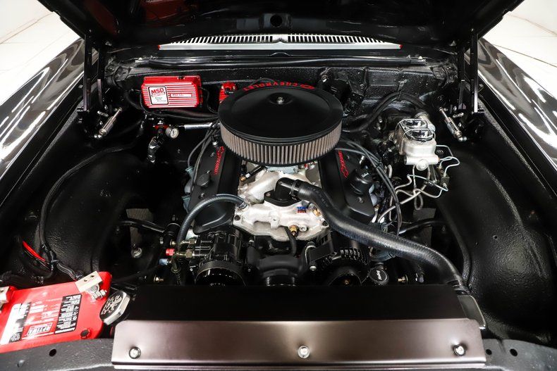 UNDERSIDE: Body off frame restored with significant upgrades. It has a Ridetech steering and suspension. Upfront has coilover adjustable gas shocks, Strong Arms control arms, Musclebar swaybar, Tru Turns steering system and a Saginaw 12:1 ratio steering box. In back it has a unique SpeedTech torque arm, 4 link tubular control arms, coilover adjustable gas shocks and a panhard bar. Upgraded Wilwood brake system with drilled and slotted rotors, six piston calipers in front. The stainless exhaust system has a crossover pipe and polished Borla mufflers. New fuel system including the tank. Looking up at the motor it has an extra capacity oil pan and high torque starter. The 5-speed Tremec uses a Zoom clutch. In back is a Dutchman 9 inch rear end with posi gears.