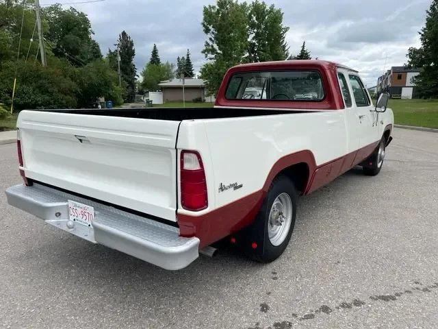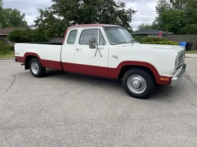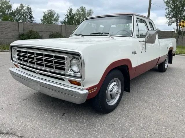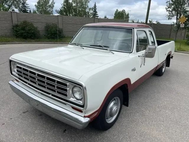 This 1974 Dodge D200 is a rare one-owner example, originally custom-ordered from Renfrew Chrysler in Calgary and preserved in exceptional condition. The truck received a full body restoration in 2005 with rust repair and was refinished in its original two-tone White over Russet Metallic. It has been garage stored ever since and shows just 69,863 original miles. The interior remains largely original with a well-preserved pleated vinyl bench seat, two fold-up rear jump seats, matching trim, and a solid dash. Mechanically, the 440 CID V8 runs strong and benefits from a recently installed battery. While the truck has a few minor cosmetic quirks such as a missing hubcap, rub mark on the armrest, and a small dent on the rear bumper, it is otherwise solid throughout and ready for weekend cruises, hauling, or display.