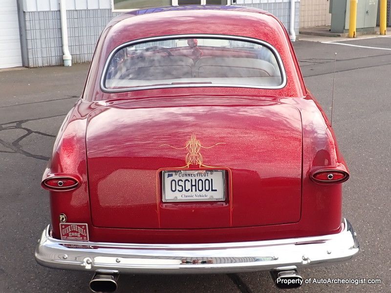 Frenched headlights and tail lights. The headlights are halogen, the tail lights from a 49 Ford. Corvette grill inset, shaved door handles, hood and trunk, and frenched rear antenna, 1957 Dodge Royal Lancer hubcaps, Jaguar rack and pinion, Chevy 350, Powerglide auto trans, leather button tuck and tuck and roll upholstery, vinyl headliner, electronic trunk release, blue dots, electric wipers, rolled wheel wells, turnpike cruiser skirts, tilt wheel (also from a Chevy), dash pinstriping, dummy spotlights and lake pipes, one piece side windows, Lokar floor shifter, fully upholstered trunk and of course, the gold flake paint that has more gold in it than a western mining town.