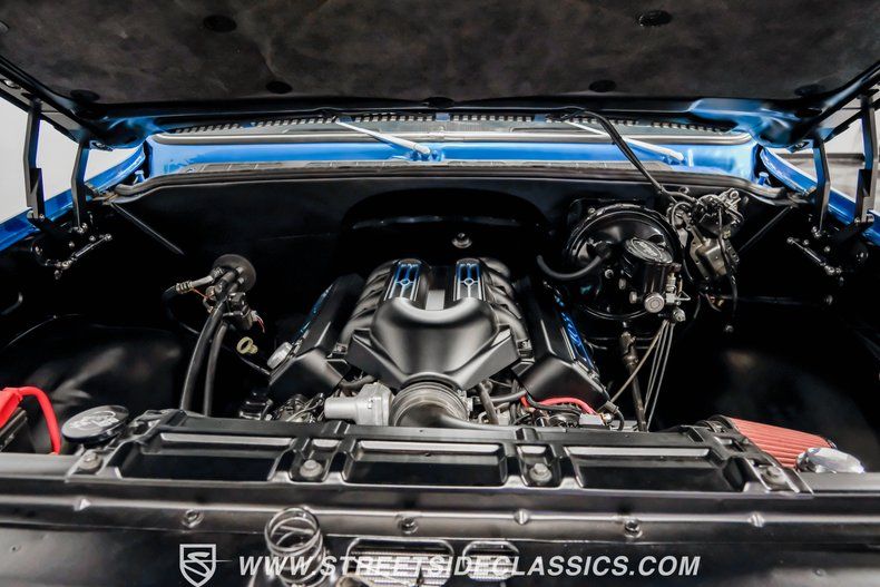 An LS3 V8 GM Performance Crate engine provides substantial power, equipped with a mild performance cam and 0821 heads. With only 2,980 miles on this powertrain, this truck offers many years of reliable enjoyment. The Tremec TR-6060 six-speed manual transmission links to a Currie 9-inch rear end with 3.55 gears for excellent acceleration and highway cruising. Four-wheel power disc brakes with Wilwood master cylinder offer superior stopping ability. The suspension system features tubular A-arms with coil springs up front and a solid axle with leaf springs in the rear. Black hydraulic hood hinges, Borgeson gear box, and a Flowmaster dual exhaust system round out the impressive mechanical package.