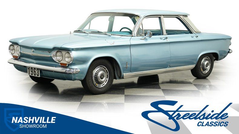 Air-cooled engineering meets compact design in this 1963 Chevrolet Corvair Monza, finished in Silver Blue paint that reflects Chevrolet's bold approach to alternative powerplant placement. Four doors provide access while maintaining the Corvair's distinctive profile, with 13" wheels supporting 185/70R13 tires at all four corners. The single exhaust system exits cleanly, and the repainted exterior shows the attention given to refresh this unique General Motors design that dared to be different from Detroit's conventional offerings.