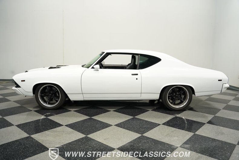 Factory 1969 hardtop transformed into pure pro touring machine, this 1969 Chevrolet Chevelle Pro Touring wears white paint that covers every panel from nose to tail. Functional hood vents cut through the front end while 18" Boss wheels wrapped in 245/45ZR18 front and 285/40ZR18 rear rubber plant this machine firmly on the asphalt. The hardtop profile keeps things clean, and blacked-out trim details add the right attitude. A full repaint brought everything together, creating the kind of presence that belongs on both back roads and car shows.