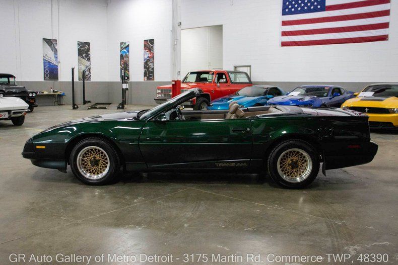 GR Auto Gallery is pleased to present this well-preserved 1992 Pontiac Firebird Trans Am Convertible for your consideration. Finished in a rare Jade Green exterior over a clean Beige interior, this low-mileage Trans Am shows just 51,839 original miles on the odometer. Under the hood is a 5.0L V8 producing 220 horsepower, mated to an automatic transmission. This Trans Am has been well cared for and recently received several updates, including new fuel injectors, newer tires, a new battery, a new idler arm, and new front disc brakes. Additional features include a convertible top, functioning heat and air conditioning, power windows, power mirrors, an aftermarket Python remote start system, a Kenwood Bluetooth-capable stereo (with the original radio included), a 3MR engine strut bar, original owner's manuals, and more. Drive this one out of our showroom or have us assist with shipping it to you anywhere in the United States! Don't hesitate to call us with any questions or for more information.