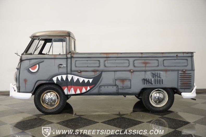 Adorned with WWII fighter plane-inspired shark graphics, the 1959 Volkswagen Single Cab Pickup Type 2 makes an immediate visual impression. Gray paint provides the perfect canvas for the custom shark artwork, giving this German commercial vehicle a unique personality all its own. The bed offers practical cargo space, while the sturdy 15" steel wheels with VW center caps provide the foundation for the 215/75R15 Toyo Open Country AT tires. Every angle of this classic hauler displays the simple, functional design that made these VW trucks such workhorses.