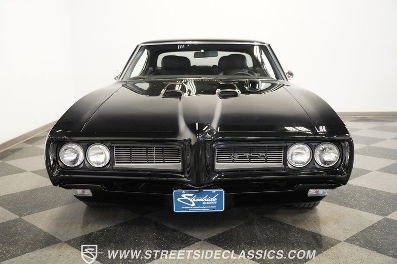 This 1968 Pontiac GTO, all muscle finished in a deep black that seems to stretch into infinity, asserts its dominance with more than just its color. Its distinctive hood, crowned with dual scoops and a hood tach, as well as a Judge style rear wing ad to the excitement. Perched on 15-inch Pontiac Rally ll wheels that anchor it firmly to the asphalt, its road presence is undeniable. The car's stance is aggressive, with BF Goodrich Radial T/A front tires sized at 205/60R15 and wider rear tires at 235/60R15, ensuring that every bit of power is translated directly to the road. This GTO makes an entrance with the unmistakable allure of American muscle.