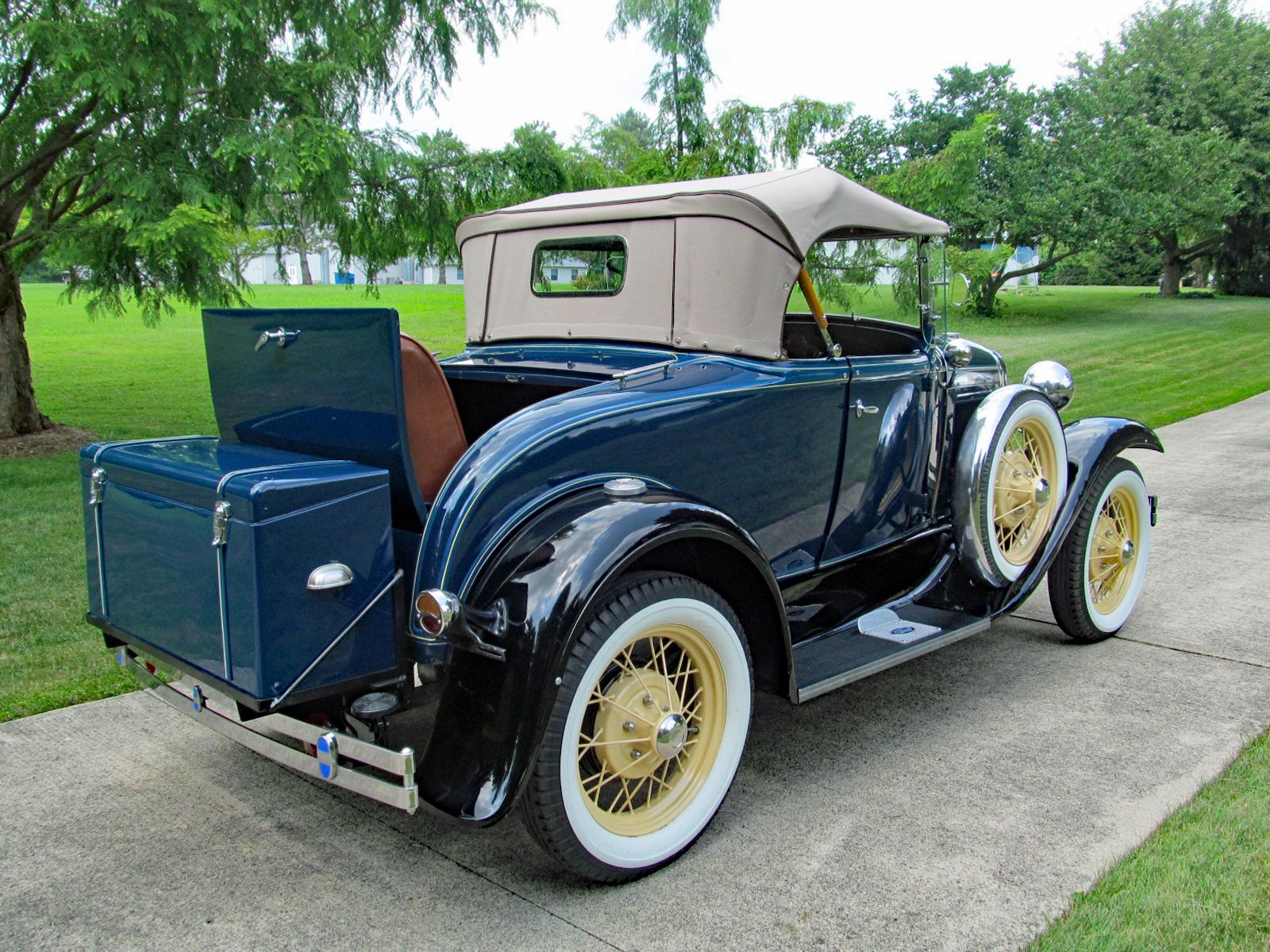 1930 Ford Model A Deluxe Roadster Convertible with Dual Sidemounts and Rumble Seat. Call Pete or Andy 419-668-1884. Excellent. Off Frame Restored. Recent mechanical service including engine rebuild with receipts. Detailed Chassis. All Steel. Finished in Washington Blue and Riviera Blue with Straw pinstripe and wheels. Brown Leatherette interior. Tan Cloth Convertible top. Powered by Ford’s 200 cubic Inch Flathead 4-cylinder engine. Electric Start. Four Speed Synchronized Manual Transmission. This Roadster is equipped with lots of great options and accessories. Stone Guard. Vacuum Windshield Wiper. Cowl Lamps. Dual Sidemounts with Metal Trim Rings. Ford Script Step Plates. Driver Side Mirror. Passenger Side Mirror. Rumble Seat. Trunk. Shocks. Firestone Wide White Wall tires. Turn Signals and Seat Belts have been added for modern touring. Excellent Road Manners. Ready to Drive, Show and Enjoy. Call Pete or Andy 419-668-1884 BE SURE TO WATCH THE VIDEO!