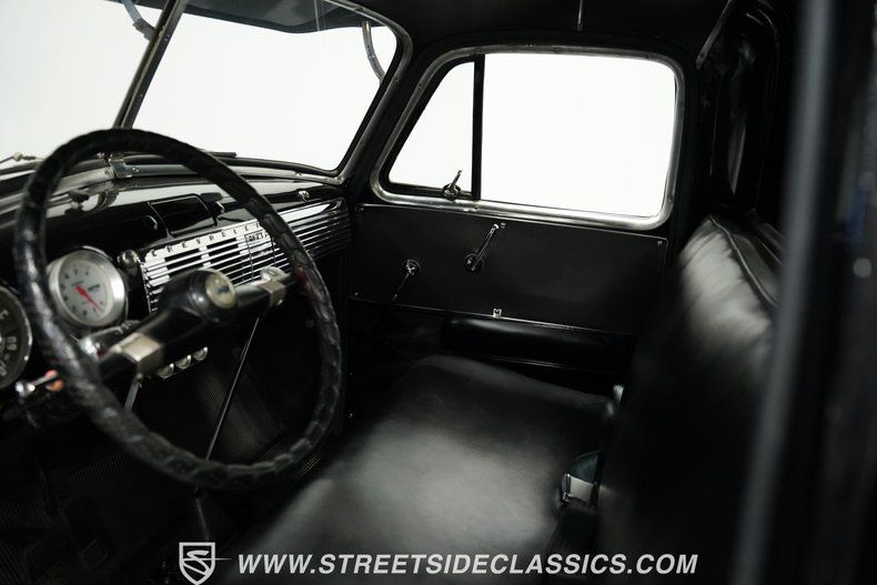 Black vinyl covers the bench seat, offering straightforward comfort in traditional pickup style. The dashboard keeps its factory layout while adding helpful upgrades for modern use. Extra instrumentation includes a tachometer mounted on the steering column plus auxiliary gauges below the dash for monitoring engine conditions. The floor houses a Lokar shifter for easy gear selection. The original-style steering wheel features a comfortable wrap, connecting directly to the manual steering for authentic road feel. Seatbelts add safety to the otherwise period-correct cabin.
