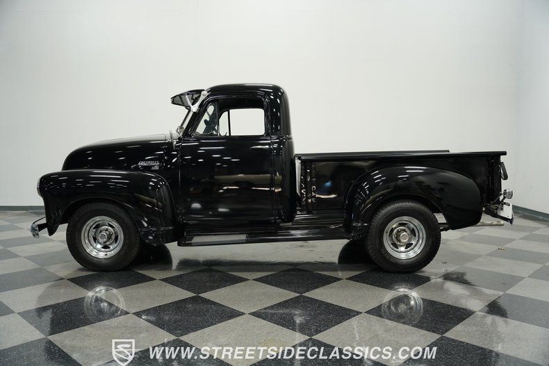 Restored to excellent condition in 2013, the 1952 Chevrolet 3100 pickup displays its black paint with remarkable clarity. Every body panel shows quality finish work, giving the truck a uniform appearance from front to back. An exterior sun visor shields the windshield, adding both function and period-correct style. The 15-inch aftermarket chrome wheels fit properly beneath the fenders, wrapped in P235/75R15 radial tires for improved roadholding. A fresh wood bed adds authentic detail to the rear, while all brightwork has been refreshed during restoration. The short bed design maintains original proportions while the overall look remains clean and direct.