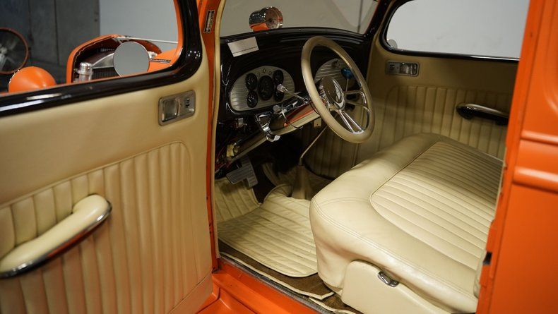Crafted from genuine steel throughout, from body to fenders and running boards, this 1934 Chevrolet 5 Window Coupe sports a distinct matte orange finish. The clean, streamlined profile benefits from shaved door handles and frenched antenna and tail lights for a smooth, uncluttered appearance. Contrasting American Racing wheels - 15"" up front and 16"" in back - complete the stance, wrapped in 195/65R15 front and 235/65R15 rear rubber. A cowl-mounted tachometer adds a functional touch to the classic profile.