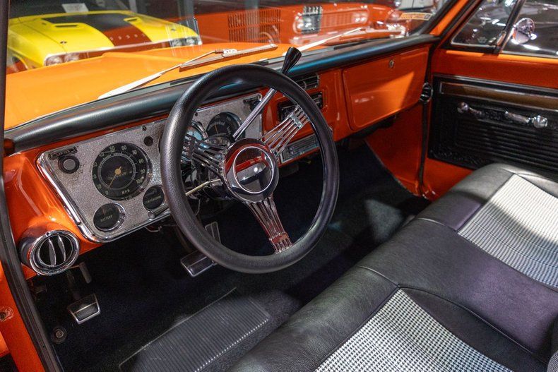 This 1971 Chevrolet C10 Pro Touring Short Bed Pickup Truck is an absolutely gorgeous, modified pickup truck with fantastic features while maintaining a mostly stock look! Chevrolet's truck division began producing trucks in 1918 with two models, a half-ton and a one-ton. As the years progressed, Chevy trucks rose immensely in popularity as the public recognized the utilitarian value of light duty trucks. Simultaneously as demand for Chevrolet's light duty trucks rose, so did customers' desire for their trucks to be more luxurious, more plush, and more fully featured as they had become accustomed to in their cars and while they were using trucks as daily transportation. Over the next few decades, the GM marque began offering higher trim levels in its light duty pickup trucks largely due to customer demand. 1971 was a banner year for Chevrolet as it became the first automaker to sell over 3 million cars and trucks, with Chevy's trucks accounting for nearly one quarter of the 3+ million vehicles sold. Additionally, the nearly 700,000 trucks Chevrolet sold in 1971 was also a record for the General Motors division. Stylistically, the light duty trucks in underwent a noticeable redesign the '71. New grille styling featured an updated egg-crate look comprised of 5 horizontal blades with 15 intersecting vertical blades that gave the trucks a more "macho" look up front. Furthermore, 1971 marked the first time that disc brakes came as standard equipment for light duty Chevy Trucks which greatly improved stopping power and braking performance and signaled an industry-wide shift to disc brakes that would become commonplace through today. More recently, Chevy trucks have become a favorite platform for restorers to build the classic trucks as Pro Touring or Restomod likely due to their timeless design along with the substantial availability of parts and upgrades. With additional creature comforts and a vast array of styling add-ons, these Pro-Touring Chevy Pickups are even more comfortable and stylish, and are an absolute joy to take on longer cruises and trips. This particular C10 Pro Touring Pickup Truck comes to us most recently from southern-based collectors who clearly took great care of this truck while under their stewardship. Powering this '71 Chevy 1/2 Ton Pickup is a 350 cubic inch V8 upgraded with an upgraded Edelbrock single 4 barrel carburetor. Exhaust exits the 350 powerplant via a set of tubular headers and out through a dual exhaust system complete with XLerator Mufflers and chrome tipped tailpipes, that together create a terrific throaty sound. The 350 Chevy V8 is backed by a TH350 Automatic transmission that makes this Pro Touring Pickup an easy truck for anybody to drive to the local car show or just take on an afternoon cruise. This 1971 Chevy C10 Pickup is absolutely loaded with superb options. With power front disc brakes, bringing this gorgeous pickup to a complete stop is easy especially compared to stock manual drum brakes. Power steering is another wonderful addition on this tastefully modified Chevrolet since the overall driving experience is much improved and squeezing into a tight parking space is a total breeze. Further helping with parking efforts are dual chrome outside mirrors so that you can better see what's along side of you. Riding on a set of 20 inch U. S. Mags Wheels, with 245/45R20 radial tires up front and 275/45R20 radials in the rear, this '71 C10 has a great look and even better ride! The chrome and brightwork around the exterior of this truck looks great as well, most of which looks to have been recently replaced. The steel Fleetside pickup box and tailgate are in such great shape too that you probably won't want to haul gravel in in. The all steel body has been completely repainted in Hugger Orange paint that completes the exterior look of this fantastic classic pickup truck. The interior of this 1971 Chevrolet C10 Pro Touring Short Bed Pickup Truck is an absolute stunner! The black leather molded bench seat looks to be brand new and is accented with black and white houndstooth cloth inserts. The deluxe woodgrain trimmed door panels, black carpeting, padded dash, and custom leather wrapped steering wheel are all in fantastic shape as well and elevate the interior appearance of this '70s classic pickup. The interior also features a couple of fantastic updates! You'll be able to stay cool even on the hottest summer days since this Chevy Pickup comes equipped with upgraded Air Conditioning. Additionally, you can listen to all of your tunes thanks to an upgraded AM/FM/CD/AUX/Bluetooth entertainment system. The factory-style instrumentation remains complete with a 100 MPH speedometer, battery gauge, temperature gauge, oil pressure gauge, and fuel gauge, and a column-mounted SunPro 8,000 RPM Super Tach II has been added as well. Whether you're buying your very first classic pickup truck or you're adding to your existing collection of classic cars and trucks, this 1971 Chevrolet C10 Pro Touring Short Bed Pickup Truck would make an excellent choice. Give Ellingson's a call today at 763-428-7337!
