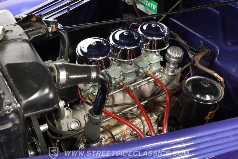 Under that steel hood, we find a classic 255 cubic-inch Flathead V-8 engine. While it still uses stock head and engine bolts, this motor has been upgraded to Tri-Power carburation along with an Offenhauser intake manifold and a performance-oriented camshaft. All told, this engine has gone from 125 horsepower to a stout 235 horsepower, and with just 23,000 miles on it, there is plenty of life left for you to enjoy. Those ponies are routed through a three-speed manual transmission before being sent out to a live axle rear, where they are transferred to the pavement via body color 16-inch wheels shod in throwback white-walled tires.