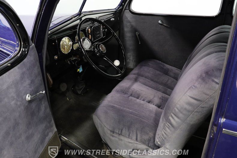 If you've been looking for a vehicle with a long heritage and timeless appeal, then this 1938 Ford Tudor Sedan deserves strong consideration. Fully repainted in a beautiful dark blue, this pre-war sedan sports curvaceous fenders, sleek lines, and a vertical-bar grille integrated into its pointed yacht-like nose.