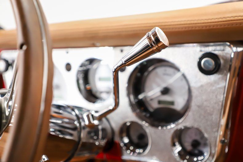 INTERIOR: It has a very classy custom upholstery job. The bench seat, door panels and even the headliner are matching materials with custom stitching. I like the cup holders built right into the seat! Dash pads are also upholstered to match. It has a new chrome instrument bezel which is home to some sharp looking white face custom gauges. The glovebox door was chromed like a mirror. A retro stereo fits in the factory location, there are kick panel speakers delivering your favorite songs. Upgraded Vintage Air heater controls that have electric slides instead of cables. The walnut steering wheel is mounted on a chrome tilt column. It has nice carpet down on the floor with matching floor mats. It was given an updated wiring system and it even has power windows!