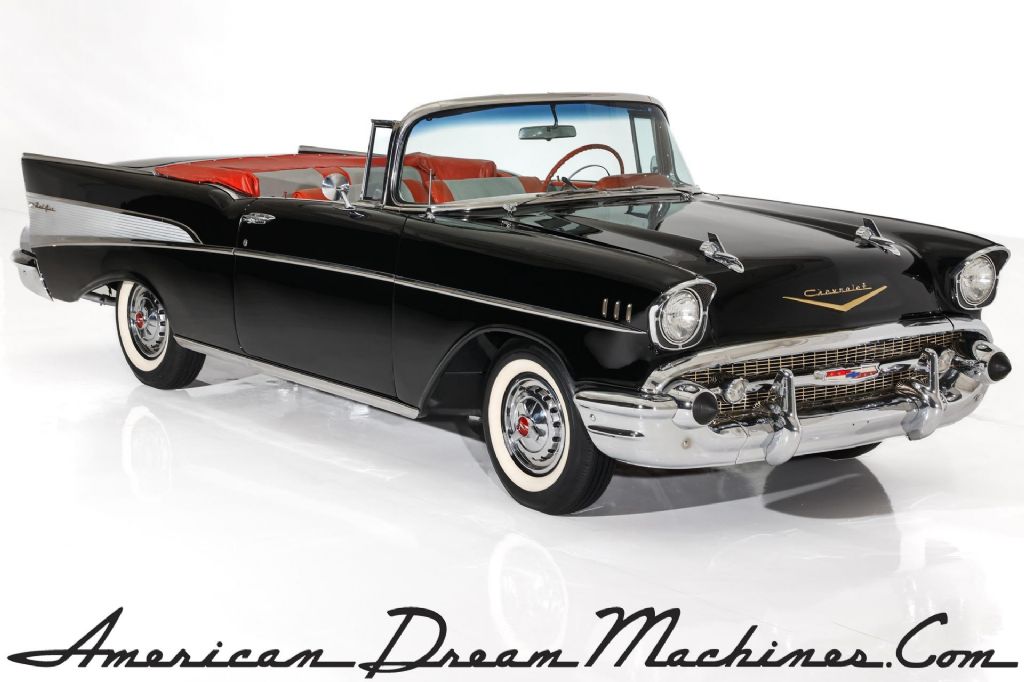 Onyx Black 1957 Bel Air Convertible with red interior. Frame-off restored, National AACA Award winner, 283 Power Pack engine with 4 barrel carburetor. This is a very special factory black Bel Air, with correct two-tone red and silver interior, that received a no expense spared, frame-off restoration to compete for prestigious AACA, Antique Automobile Club of American, Senior Class award, which it won. This Iconic Black Bel Air has been in a private collection of cars since competing, but still looks absolutely amazing today, as you can see by the undercarriage. This nostalgic icon car is rolling on steel wheels, Bel Air caps and wide whites and would make a great addition to any collection.
