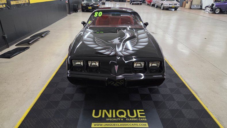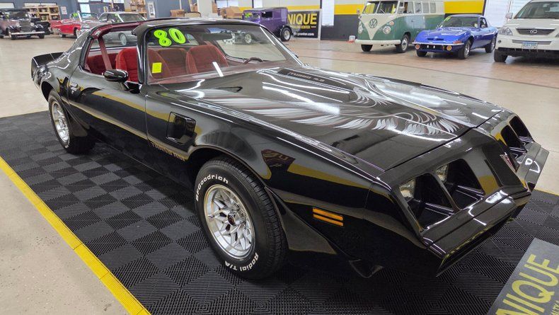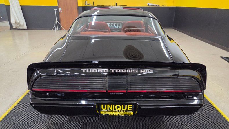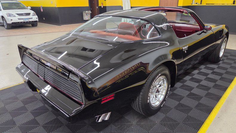 1980 Pontiac Trans Am T-Top Turbo coupe. Equipped with the 4.9L (301 cubic inch) turbocharged V8 engine and a Turbo Hydromatic 350 automatic transmission. CC1 code car. NUMBERS MATCHING - both the engine and transmission are original to the car. It features classic 1980s styling with Starlight Black exterior paint and a red interior, complemented by snowflake wheels with BFG Goodrich radial tires. The odometer shows 33,156 MILES! Believed to be original, though the mileage cannot be officially verified due to title recording exemptions for older vehicles. The vehicle is well-preserved including the hood bird emblem and T-top roof panels, which are smoked semi-transparent glass. The car is equipped with power steering, power brakes (four-wheel discs), power windows, power locks, COLD air conditioning, tilt steering column, cruise control, and a working power antenna. The interior is in very good condition, with bucket seats and a center console, and the original stereo system is functional. The hood houses a clean and tidy engine bay with the turbocharged V8 and heat shielding intact. On the road the car's smooth crisp throttle response, accelleration, great cornering for its era, and overall impressive fun driving dynamics are evident!