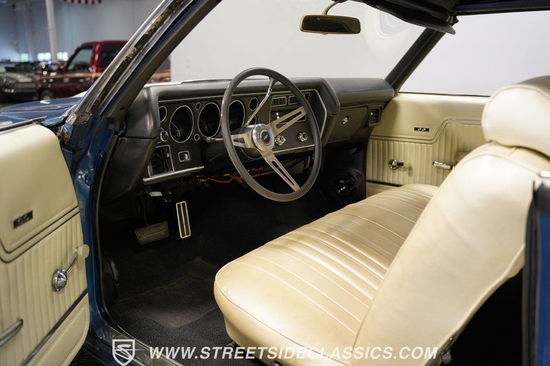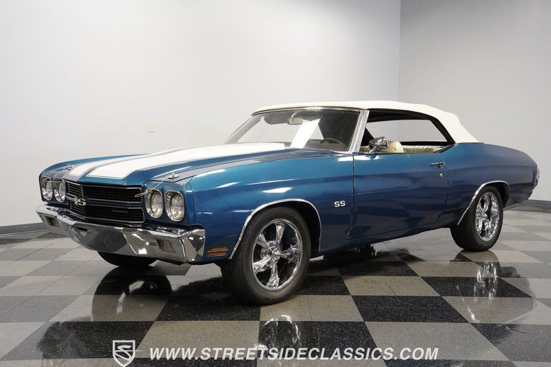 This exciting 1970 Chevelle Convertible is finished strikingly in Blue with contrasting white SS stripes that accent the muscular cowl hood on this beautifully restored classic Chevy. A set of custom Ridler mag wheels wrapped with Nexen performance tires staggered 225/55ZR17 front and 235/40ZR17 rear give the car just the right muscle car stance.
