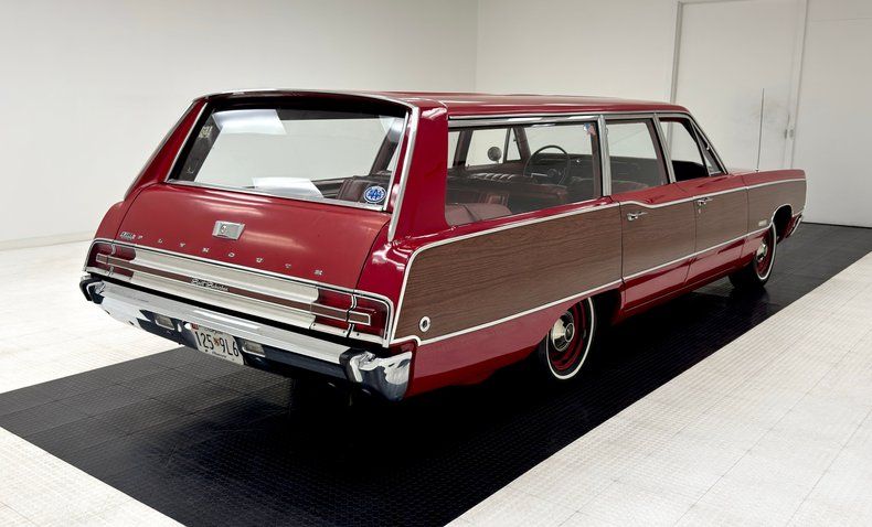 Gloriously 60's in every way, the long panels are of course adorned with woodgrain applique framed by single stage Matador Red rolling on red 14-inch steel wheels with Plymouth hubcaps. The Fury looks a little furious with the stacked headlights and narrow grille, a squared grimace at the head of a long car, 217 inches in all, with an extended overhang past the rear axle. A flat roofline parallels the shoulder line and between them, glass on glass, a giant greenhouse out from which we watched the world go by, (you know, before iPhones!). The back of the car is a clinic in right angles and a big picture window which would become an entertainment screen for those behind you. The tail lights are integrated into the aluminum bar across the back, low on the body, are fantastic. Imperfections include some scratches, surface rust on the wheels, and just general overall patina that frankly, we wouldn't touch!