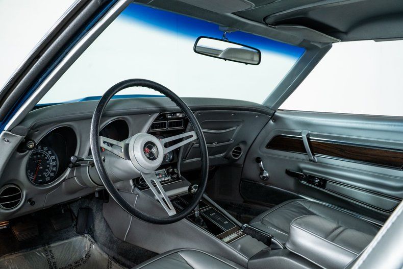 The Bright Blue exterior with removable T-tops highlights the unmistakable lines of the Corvette Stingray. Inside, the silver leather interior shows off factory originality and features air conditioning, tilt and telescopic steering, power brakes, and power steering.