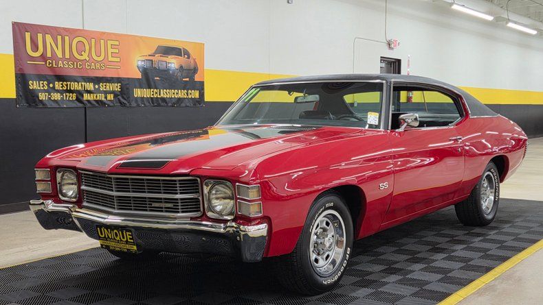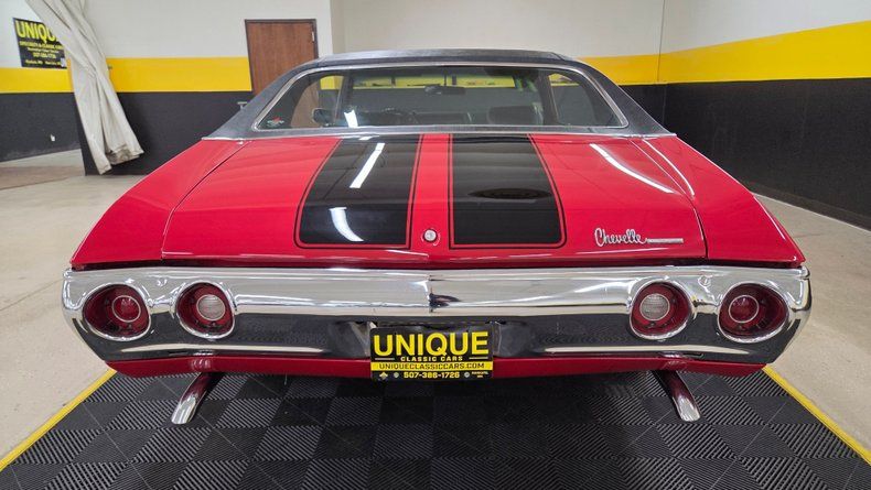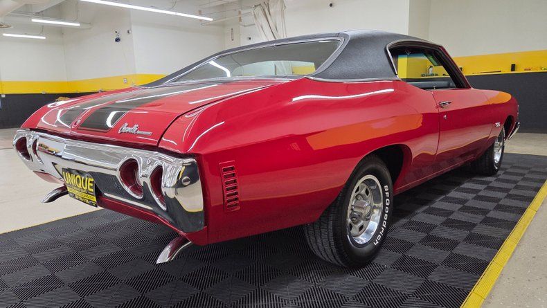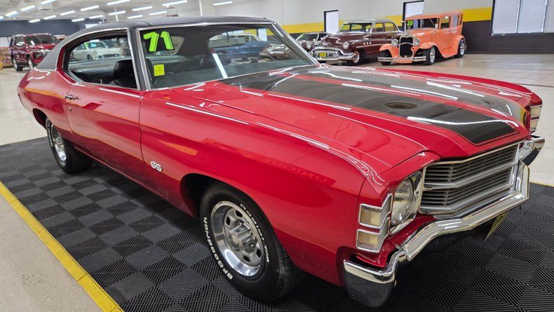 1971 Chevrolet Chevelle Malibu two-door hardtop. This particular model features a NUMBERS MATCHING 350 cubic inch V8 engine paired with a NUMBERS MATCHING Turbo Hydra-Matic 350 automatic transmission. The transmission was rebuilt in 2021. The car's exterior is a cranberry red paint with a black vinyl roof and black racing stripes, complemented by chrome accents and slotted wheels with beauty rings and Chevy center caps. Riding on BFG radials with white letter tires. Paint in very nice condition with a great shine to it. The interior features black vinyl upholstery in great condition, though there are some holes in the headliner. Original trim and seat belts are intact. Equipped with air conditioning, power steering, and power brakes, AC requires attention to blow cold. On the road the car handles smooth, comfortable and easy to drive, with nice positive automatic shifts, and an appealing exhaust note.
