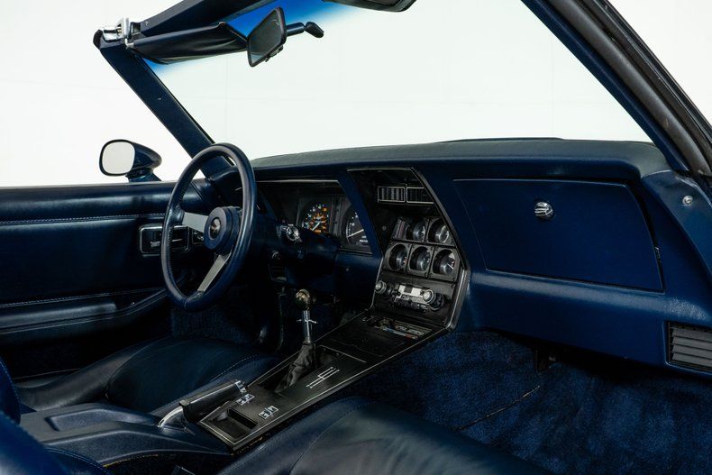 Finished in Corvette Dark Blue, this Corvette coupe presents beautifully with tinted T-tops and factory 15-inch aluminum wheels. The blue leather bucket seat interior is well-preserved, showcasing the care this car has received over its lifetime. Features like power steering, power windows, power door locks, and air conditioning highlight how well-equipped this C3 Corvette coupe was from the factory.