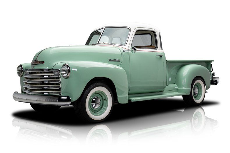 Finished in a classic mint green and cream two-tone with a hand-painted red beltline stripe, the truck's bodywork keeps every defining line of the original design intact. The desirable 5-window cab adds curved corner glass that improves visibility and gives the truck its signature wraparound profile, making it one of the more collectible configurations in the Advance Design lineup. The rounded fenders, divided windshield, and signature five-bar chrome grille instantly read "1950s Chevrolet," but the execution here is show-quality throughout. Polished bumpers and trim shine like new, and the proportions sit just right over painted 15-inch steel wheels and wide whitewall BF Goodrich Radial T/As. The bed features an aluminum floor finished to resemble fine-grain wood, blending tradition with clever modern craftsmanship. Every panel fits cleanly, every surface is dialed-in, and the result is a presentation that looks factory fresh while clearly built to a higher standard.