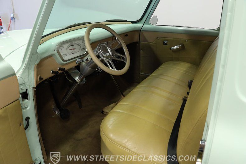 Inside the doors, you'll find the same theme of vintage visual appeal, combined with excellent functionality. The tan vinyl bench seat is in great condition that's matched by the door panels to each side, and the paint scheme on the dashboard is almost certain to make you do a double-take. It's cleanly applied, accenting an instrument panel that contains a set of added aftermarket gauges to keep tabs on your motoring functions. A very sharp and compact steering wheel is now perched on a tilting column, and you'll have a Lokar shifter at your disposal when it comes time to put this truck through its paces. The added under dash climate control system is functioning at its best to keep you and your passengers nice and comfortable throughout the year.