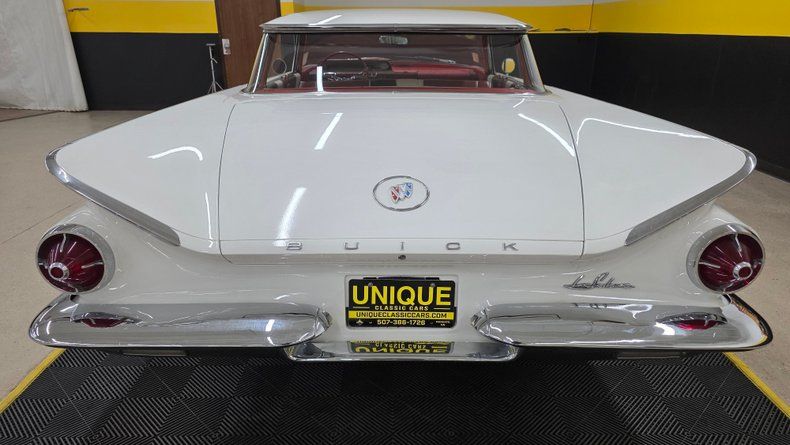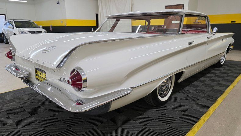 1960 Buick LeSabre four-door sedan, flat top, with Arctic white paint and red/black interior.