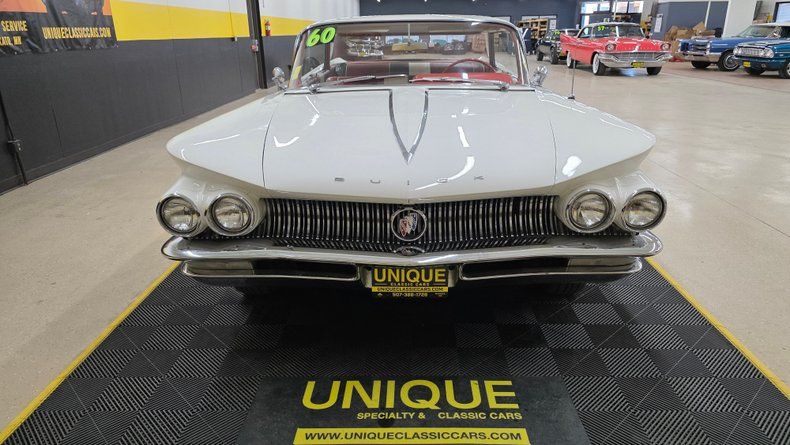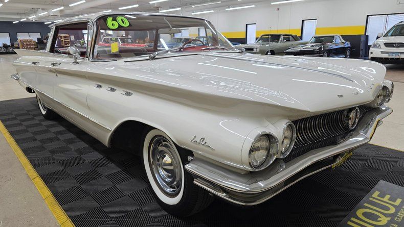 1960 Buick LeSabre four-door sedan, also referred to as a "flat top" due ot the distinctive roof design. Arctic white exterior with a red and black vinyl interior, and a NUMBERS MATCHING 364 cubic inch V8 engine paired with an automatic transmission. Iconic 1960 Buick front grille, swooping body lines, and the signature tail fins, a classic piece of automotive art. When looking at the speedometer, look closely, you are actually looking at a mirror. Recent service includes new rear brakes, lower ball joints, front and rear wheel cylinders, and brake hoses. Note there is a chipped grille piece, pitting on the rearview mirrors, some wear on the interior vinyl, some cracks in the glass on the driver's door, a bypassed heater core, and a drip from the transmission. Great power steering, "Sonomatic" AM radio and a uniquely styled speedometer are working well. To start, turn the key, hold the brake and depress the throttle all the way. On the road, a smooth and luxurious ride, with responsive acceleration, a great driving experience and road presence.