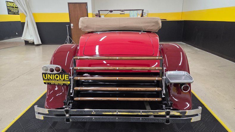 1929 Packard 633 Standard 8 Runabout. Eye catching original and restored features, including sidemounted dual spare tires, wide whitewall Firestone bias tires with red wheels and pinstriping, and exquisite chrome and brightwork from the bumpers to the ornate radiator surround. The car's paint job is a striking two-tone red, reminiscent of Packard's original Mountain Splash Scarlet color, with a well-maintained finish free from major blemishes. The interior has been reupholstered in a maroon/burgundy leather that matches the rumble seat, complemented by an original looking dash and beautiful carpeting. The car's engine, an inline 8-cylinder (approximately 319 cubic inches), was rebuilt by a renowned Packard engine builder between 2016 and 2018. It runs quietly and smoothly, with incognito LED-converted lights and a functional fuel shut-off valve designed to preserve fuel prime when not in use. The vehicle is not just a showpiece but also a reliable driver, suitable for both concours shows and casual drives. The convertible top and mechanism is in excellent condition, featuring a camel-colored fabric with wood adorned bows and a glass rear window. There is an electric fuel pump for easier runnability, and push-button start, to the left side of the dash. Featuring a center headlight that turns when you steer the wheel, and storage for golf clubs with a locking door on wither side of the vehicle giving access. On the road the car's smooth handling, very nice clutch feel and shifting, responsive steering, and luxurious solid feel are evident. A car that drives as good as it looks.