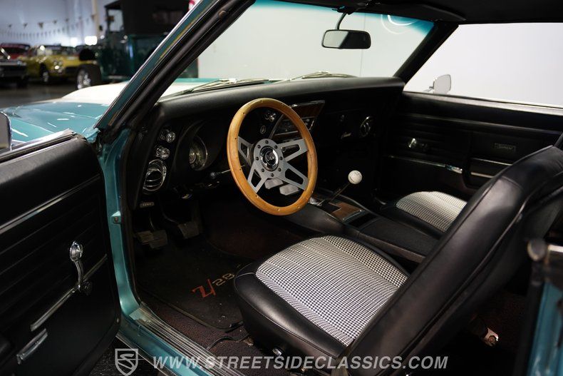 This 1968 Chevrolet Camaro Z/28 Tribute wears Island Teal paint accented by white striping running down its iconic cowl hood. Classic 15-inch rally wheels are wrapped in 225/60R15 and 245/60R15 BF Goodrich Radial T/A rubber for the perfect muscle car stance. Clean glass flows across all windows, while a rear spoiler caps off the back end.