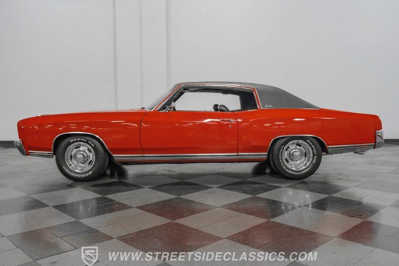 This 1972 Chevrolet Monte Carlo showcases one of GM's most successful first-generation designs, selling over 180,000 units in '72 alone. The Flame Orange exterior radiates muscle car excellence, perfectly complemented by a black vinyl top that flows with the car's sweeping lines. The 15-inch Rally wheels add athletic appeal, wrapped in BF Goodrich Radial T/A 235/75R15 front and 275/70R15 rear tires for the perfect stance. The chrome bumpers and trim gleam against the paint, creating a powerful presence that exemplifies American muscle car design.