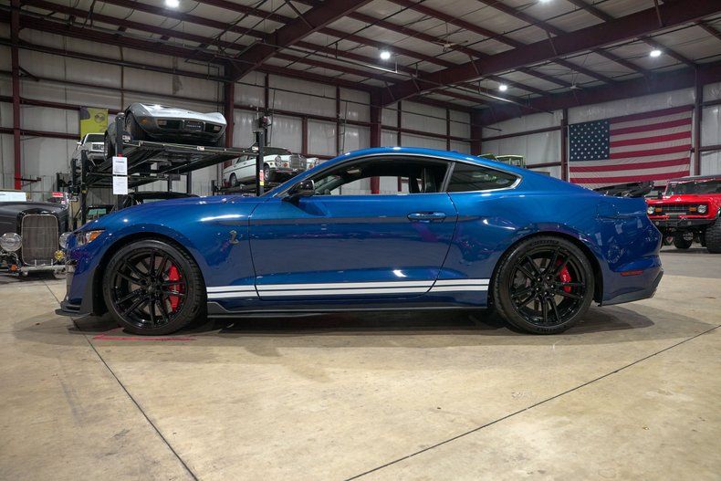 GR Auto Gallery is excited to present this 2022 Ford Shelby GT500. Finished in striking Atlas Blue with bold dual white racing stripes, this Shelby looks every bit as aggressive as its performance promises. The black rear wing, exposed carbon fiber accents, large hood vent with push button hood pins and Brembo brakes complete the unmistakable Shelby appearance. Every angle of this car makes a statement, and its presence is undeniable on the street or at the track.